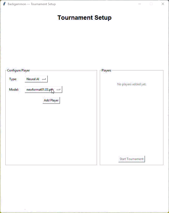 A full Backgammon engine with five AI opponents of increasing sophistication, a tournament mode that runs any combination of bots round-robin, and per-bot parameter tuning via a setup UI — no code changes required.